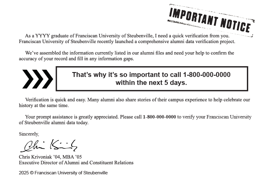 Have you moved or changed your phone number or email? As part of this project, we’re working to ensure your contact information is accurate and up to date. This helps us stay in touch and keep you connected to the Franciscan University community.